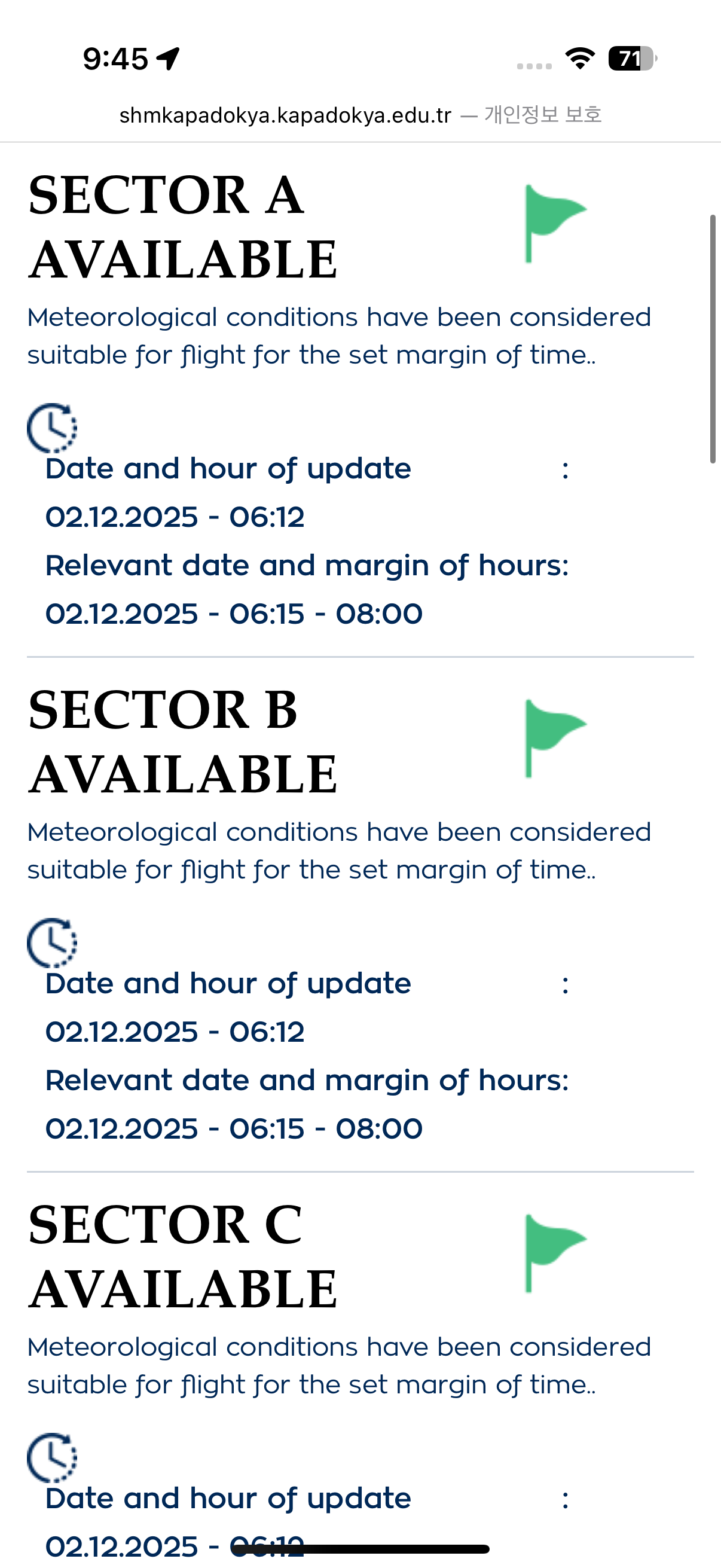 사실 열기구를 타기까지 마음고생이 꽤 있었습니다. 떠나기 한 달 전부터 계속 확인했거든요. 열기구 운항 여부를 알려주는 깃발을 보면, 초록 깃발(저희가 탄 날짜입니다)은 일주일에 한두 번 볼까 말까, 대부분은 매일 빨간 깃발뿐이었습니다.